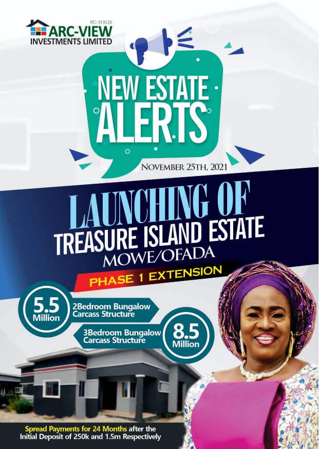 TREASURE ISLAND ESTATE MOWE OFADA *Location of Estate:* Mowe after Redemption Camp just by Nestlé Foods at the Interchange of the Lagos-Ibadan Expressway. *Types of Houses:* 2Bedroom Bungalows (All rooms ensuite, big size kitchen with a laundry area by the side, guest toilet and a large sitting room; also, each has a parking space that can conveniently park 3 to 4 cars) *3Bedroom Bungalows* (all rooms ensuite with a space for walk-in-closet in the sitting room, guest toilet, ante room, large sitting room, dining area and children's play area) *PRICES:* 2 Bedrooms Bungalow N9,500,000 - Finished N6,500,000 - Semi Finished Initial deposit is N250k and balance to be paid over 24months. Outright payment attracts 5% discount. 3 Bedroom Bungalow N10,500,000 - Finished N8, 500,000 - Semi Finished N1.5m initial deposit and balance over 24months 3years. Outright payment attracts 5% discount. *TITLE:* C of O *AVAILABLE FACILITIES:* - Perimeter fencing - Portable Water - Electricity - Security *Neighbourhood* -International Breweries -Nestle foods -Apple Hair & foods -OLam Energy And so many more *Pay 75% and get physical allocation.* For more details and inquiries call/WhatsApp +234 7062929162