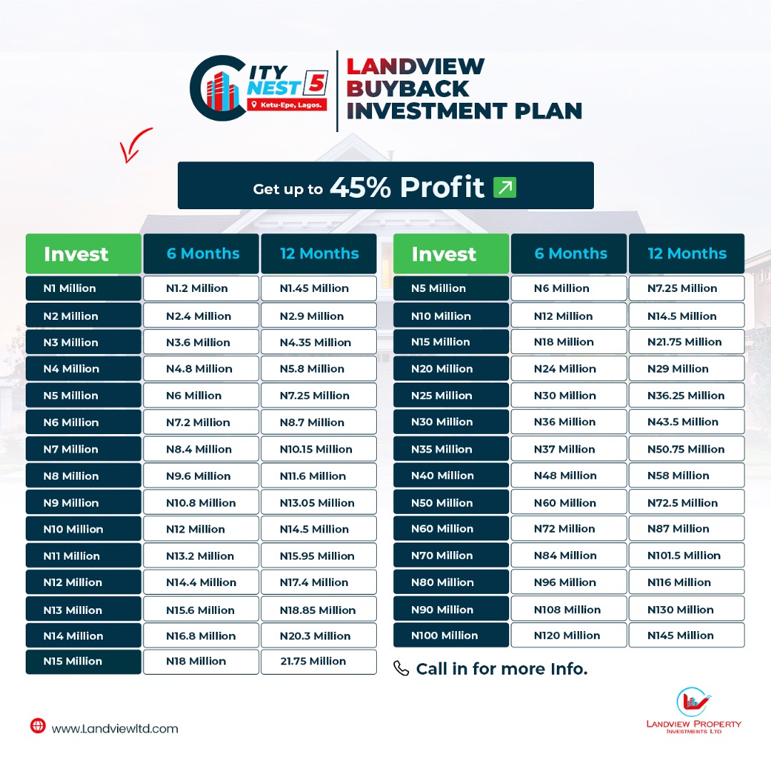*LANDVIEW BUYBACK SCHEME- CITYNEST 3 EXTENTION* 🌟 Are you ready to take your investments to the next level? Look no further! Landview Property Investments Limited presents the " *Buy Back* " *Scheme* , a game-changing opportunity to grow your wealth through real estate. ✅ *Unmatched Benefits that Set Us Apart:* ✔️ *Flexibility and Security:* Receive a post-dated cheque, a contract of investment, and a receipt to safeguard your funds and ensure a worry-free experience. ✔️ *Expert Guidance:* Our seasoned professionals Realtors will guide you every step of the way, providing personalized assistance and sharing valuable insights into the real estate market. ✔️ *Constant Growth:* Yes! You have the opportunity to take your profit and re-invest back into the scheme or you can decide to re-invest all back into the scheme. The more you invest the more money you make. *For example:* Buy 1 plot for 1m *Sell in 6 months for 1.20m* *Sell in 12 months for 1.45m* *CLIENTS WILL GET:* - DEED OF BUY BACK SCHEME/CONTRACT - POST-DATED CHEQUE - RECEIPT ACKNOWLEDGEMENT LETTER *NOTE: CHEQUE IS ONLY AVAILABLE ON REQUEST* Join our satisfied investors who have witnessed remarkable returns and financial prosperity. 🔥 Get Started Now!⏳ ☎️Contact our dedicated team at *07062929162 Invest with Landview Property Investments Likmited and unlock a world of possibilities in the real estate market. *Don't wait - start building_ your wealth today!*