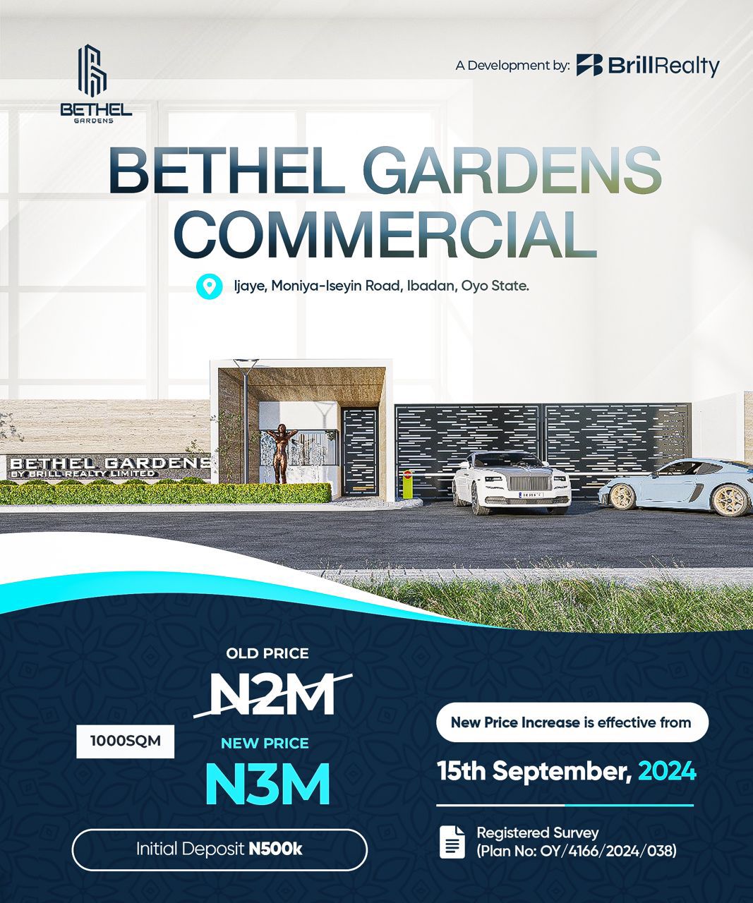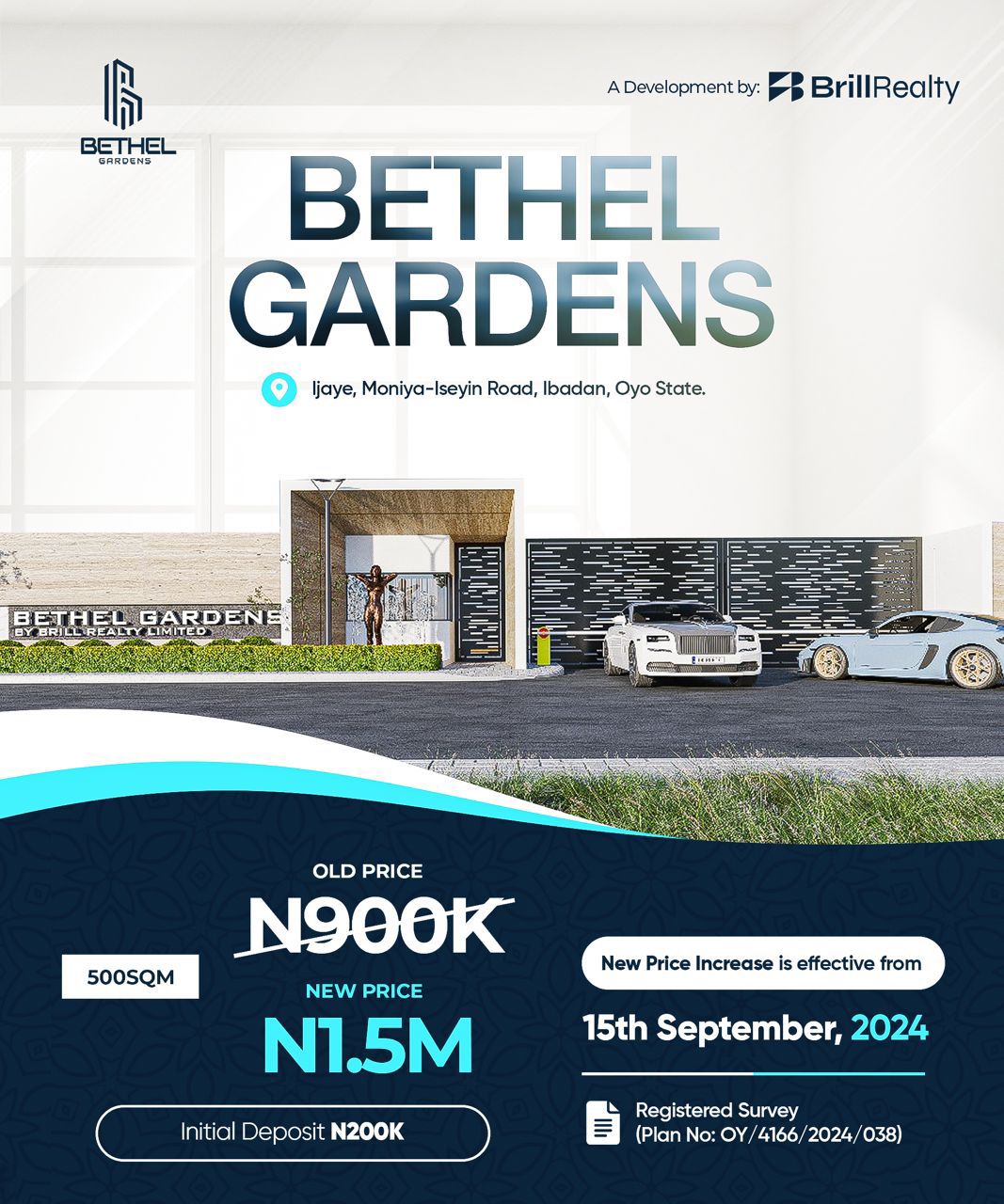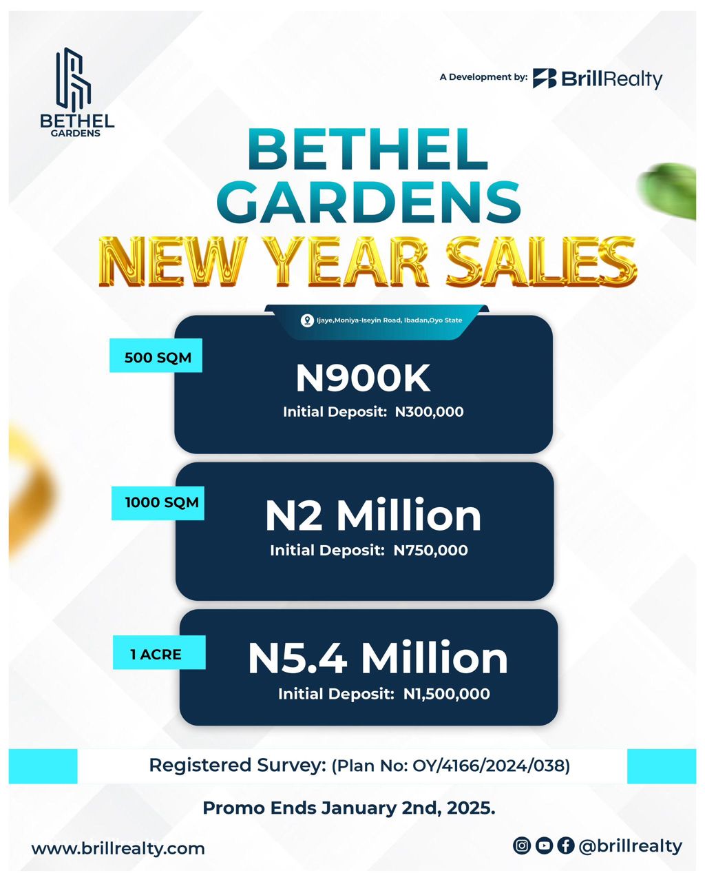 BETHEL GARDENS - Peaceful Living, Affordable Luxury right here in Ibadan, Oyo State. Discover the perfect blend of tranquility and luxury at Bethel Gardens. This eco-friendly estate offers a prime investment opportunity, and promising substantial returns. *Location: Strategically located on Ijaye, Moniya-Iseyin Road, Ibadan, Oyo State, with direct road access. Location on map https://goo.gl/maps/r4bDGu9oXPUtcaPx6 *Property Title: Registered Survey (Plan No: OY/4166/2024/038) *Prices: - 500sqm: N1,500,000 - 1000sqm: N3,000,000 New Year Offer - 500sqm : N900,000 - 1000sqm: N2,000,000 *Why Invest in Bethel Gardens? 1. Situated in Ibadan, the largest city in Africa with a rapidly growing population. 2. 100% dry land, free from government encumbrances. 3. A highly bankable investment 4. High potential for significant returns on investment. 5. Located near other estates, the train station, and key developments. *Invest in the Future Today For more details, please send a message on WhatsApp; 07069652227 or visit realex.com.ng/properties for related properties #BIOListings #Property #RealEstate #RealExMarketplace
