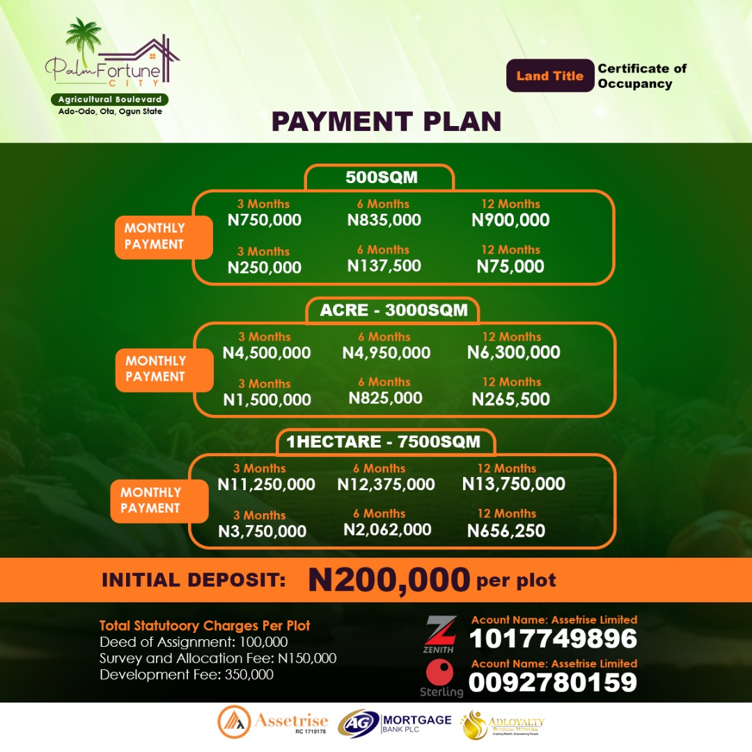 Palm Fortune City, Agriculture Boulevard Are you an agropreneur looking for a place that will support your quest resources and inputs locally and internationally to establish your staple crop, vegetable,fruit, and cash crop farming, aquatic or animal husbandry and Green house. The Africa's Premium Tourism and Agriculture City welcomes you with open hands to own units of land that will not only serve agriculture but a fast appreciating asset and a City where you live, work, create wealth and have the best of life in a serene, secured eco-friendly and nature bonding environment *Location: Ado-Odo, Ota, Ogun State. *Minimum Plot Size: 500 sqm *Land Title:* Certificate Of Occupancy( C of O) *Topography: Dry Land Sales Price: N750k *20% Discount Price: N600k *Initial Deposit: N200k *Neighborhood: *Residential District *Commercial District *Agro Processing District *PalmRich Estate Phase 4 *Agbara Industrial Estate *Ota Induatrial Layout *Ajilete Military Barracks *Convenant University *Bells University *Crawford University *Canaan Land *Canaan Land, HQ Living Faith Church, Winners Chapel *The Bells University Promo Offer Valid Till: 30th of October, 2024 For more information, visit our catalogue https://wa.me/p/8965857930159581/2347080599282 or send us a message. #RealExMarketplace #Property #BIOFarms #BIOListings