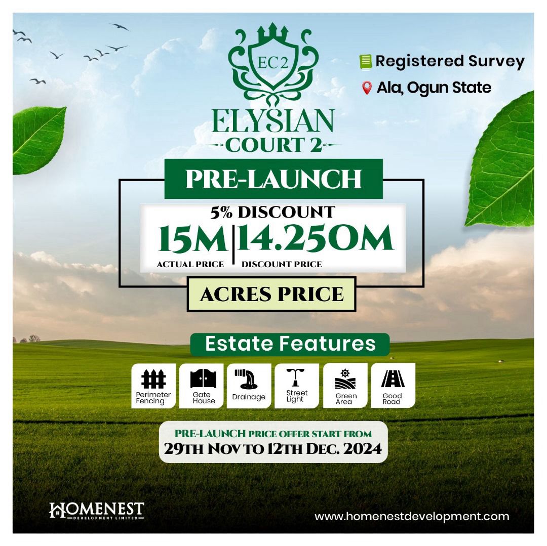 Elysian Court 2 – where luxury meet opportunity Discover the perfect blend of affordability and comfort in Ala, Ogun State. With 500sqm residential plots at a pre-launch price of ₦2.5M outright, you can start with an initial deposit of just ₦500K. *Price 2.5Million (all inclusive) *Initial deposit : 500k *Size :500sqm 🌟 Estate Features •Perimeter Fencing •Gatehouse •Drainage System •Streetlights •Green Area •Good Road Network Nearby Landmarks: .Tai Solarin University of Education •NNPC Fuel Station .Nigeria Breweries .Yaba College of Technology .Epe Toll Gate .lagos state food and logistic hub .Grace polytechnic 📅 Pre-launch offer ends 12th Dec 2024. Don't wait—secure your spot today and turn your dream into reality! For enquiries and more details contact us directly.