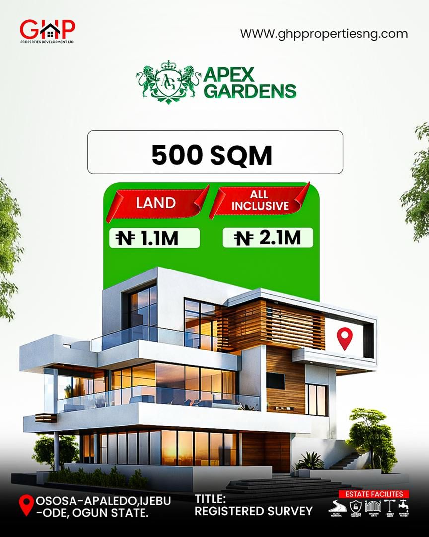 APEX GARDENS Estate Apex Gardens is an estate Where peace of mind Meets excellence Nestled in a prime location, Apex Gardens Estate offers the perfect blend of modern sophistication and natural tranquility. This thoughtfully planned community is designed to elevate your lifestyle, providing a harmonious environment for families, professionals, and investors alike. Apex Gardens Estate ensures every resident enjoys peace of mind and excellence. With easy access to key urban centers, top-tier schools, shopping districts, and recreational hubs, it is the ideal place to live, work, and play. Discover the pinnacle of refined living at Apex Gardens Estate — where dreams take root and flourish. Your future begins here. The word apex refers to the highest point, peak, or summit of something. It is describe as the topmost part or the point of greatest success, power, achievement, or excellence *Location:* Ososa Apa-Aledo, ljebu-Ode, Ogun State https://maps.app.goo.gl/otB5BozWLSd5Z3L28?g_st=iwb *Title:* Registered Survey and Deed of Assignment. *Landmarks:* - Flour mills of Nigeria - Ministry of Agriculture Lagos State. - Rite food limited ( Bigi drink company) - Tai solarin university of Education (TASUED) - City of knowledge academy - Ogun state polytechnic of health and allied science - Pogil college of health technology *Estate Features:* - Drainage System - Good roads - 24/7 Security - Perimeter fencing - Gatehouse - Direct road access - Green area *Other features:* - Commercial zone - Playground zone - Residential zone Residential plots; 500sqm Commercial plots. 500sqm Residential: - 1 Acre (3000sqm) Commercial: 500sqm: Secure yours now with initial deposit of N500,000 Get yours now! as this offer is limited Call and DM us now to get started. #RealEstate #RealExMarketplace #Property #BIOListings
