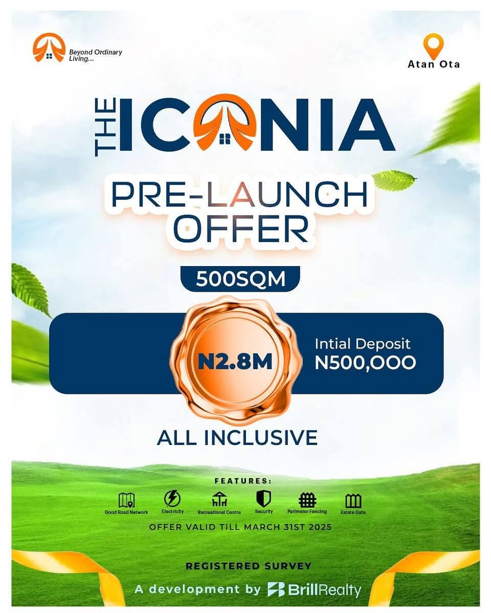 *ICONS!!!* 🛎️ 🛎️ 🛎️ 🛎️ 🛎️ *GET ON THE FLIGHT TO BUILD AN ICONIC LEGACY* *THE ICONIA IS HERE* Building a fortune is making a bold decision towards investing in a good and highly profitable real estate investment. Here is a chance to invest in one of the most sought-after areas with unbeatable features and benefits, coupled with massive potential for growth and development. *THE ICONIA* is more than just a land, it’s the next big move to build a legacy and secure the future while it’s affordable now. 🌟 *What makes THE ICONIA stand out?* ✅ Well-Connected Road Network ✅ Access to Electricity ✅ Opportunity to own a Mini Estate ✅ Top Security ✅ High Future Returns ✅ Access to great LandMarks *Location: Atan-Ota, Ogun State (Close boundary to Lagos).* *Land Coordinates:* *734 130.436mN* *501 251.699mE* DIRECTION: https://maps.app.goo.gl/ZHNaEgfwe9r1Szo66?g_st=iwb 🔆*LANDMARKS. * Winners Chapel (Canaanland, The Ark Project) * The Bells University * Covenant University * Nigeria Distilleries Limited * Indomie Factory * Nestle Company * Honda Car Manufacturing Company * Idiroko Border and many others…. 🎯 Here’s the deal you’ve been waiting for: Our Pre-launch Offer with massive discount: 🔥 500sqm for just N950K (original price N1.5M) 💥 1 ACRE for N5.4M (original price N9M) 💰 Lock it in with a deposit: • 500sqm: ₦200K • 1 ACRE : ₦1.5M • *NOTE: PRICES ARE NOT ALL INCLUSIVE. THE ALL-INCLUSIVE PRICE INCLUDES THE CofO FEE AND OTHER STATUTORY FEES AS SHOWN IN THE OTHER IMAGES ATTACHED Act fast! This offer ends on April 30th 2025 The clock is ticking, and you won’t want to miss out on these unbeatable prices. To schedule an inspection 📞 Call/WhatsApp : 07069652227 #RealEstate #RealExMarketplace #Property #BIOListings