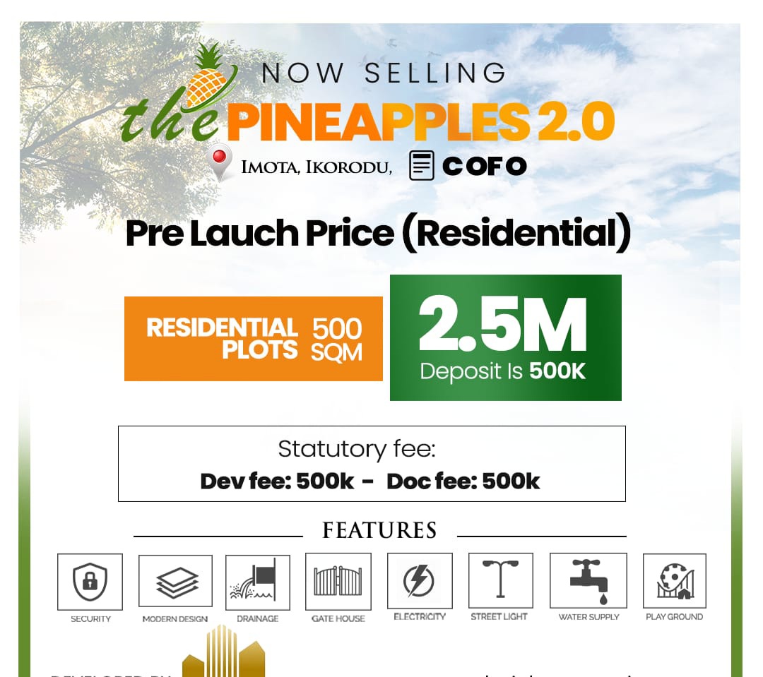 ππ’ INTRODUCING THE PINEAPPLE 2.0β IMOTA, IKORODU π’π* Buy 6 Plots, Get 1 Free! Zularich Properties limited Proudly present The Pineapple 2.0. Invest in Africaβs biggest multipurpose estate strategically located in Imota, Ikoroduβperfect for residential, commercial project. Title: Certificate of Occupancy (CofO) Location: Imota, Ikorodu https://maps.app.goo.gl/nd738LMtVCFEkfat8 *Land Sizes & Prices* β 500sqm (1 plot): β¦2.5M (Residential)* β 3.5M *(Commercial)* β 1 Acre (6 plots): β¦15M + 1 Free Plot *(Residential)* *Documentation & Development Fees* *π Residential:* β¦500k + β¦500k *π Commercial:* β¦500k + β¦700k *Flexible Payment Plans* *π° Initial Deposit:* β¦500,000 (500sqm) | β¦3M (Acre) *π 3-6 months payment plans available!* *Landmarks* π« Caleb University | π Imota Rice Mill | π Imota Roundabout β΄ Ikorodu Ferry Terminal | π LASUTECH | π« RCCG Proposed Site *Estate Features* β 24/7 Security | β Gated Community | β Well-Paved Roads β Drainage System | β Green Areas *π₯ Limited-time offer! Donβt miss out! π₯* Visit our catalogue on WhatsApp for more information https://wa.me/p/10096163780426408/2347080599282 π Call for Inspection & Subscription #RealEstate #RealExMarketplace #BIOListings #Property