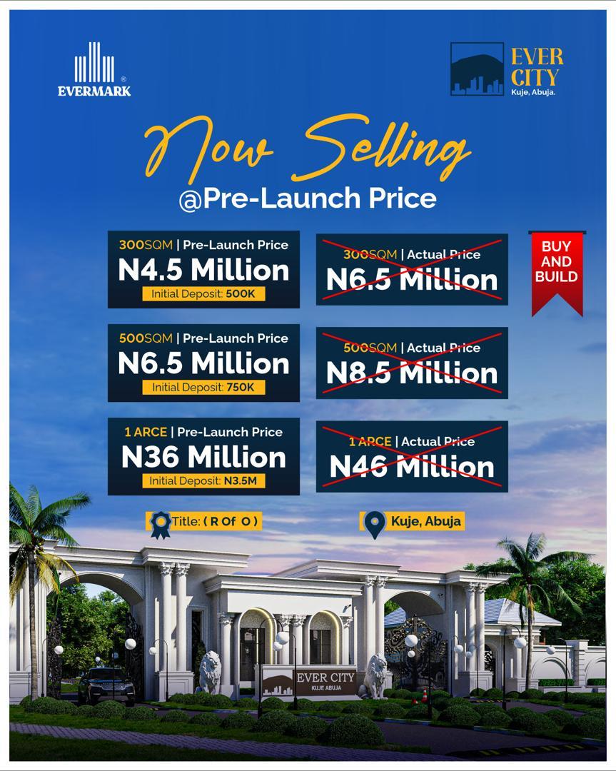 *EVERCITY ESTATE,KUJE,ABUJA* *EVERCITY ESTATE* is located strategically in kuje, Abuja, Nigeria. It a luxurious estate inspired by Royal living. The estate is aimed at housing over 500 residence of high caliber of people who would enjoy the ecosystem and amazing design of the amazing estate. *EVERCITY ESTATE* is aimed at been a home everyone who live serenity would admire and long to live and would be competing head to head with existing too estate around in terms of top notch estate planning and development. *Location*:Kuje, Abuja Google Pin: EVERCITY ESTATE,KUJE, ABUJA https://maps.app.goo.gl/rugEs9EvNqfcmQ359?g_st=com.google.maps.preview.copy -Title : Right of Occupancy *LAND TYPES & PRICES:* *PRE-LAUNCH PRICES* 300sqm - 4.5million 500sqm - 6.5million 1acres - 36million *COMMERCIAL PLOT* 500sqm- 12million 1acres- 72million *Installmental Payment Plans Available.* *This Estate is offering sites and services which includes:* - Perimeter fence - Good drainage system - Interlocked roads - Waste disposal facilities. *Neighborhoods* -Prime university -Capital science schoo -Z u m a R o c k -Jabi L a k e -Jabi Boat C l u b -Magicland Amusement Park #RealEstate #RealExMarketplace #Property #BIOListings
