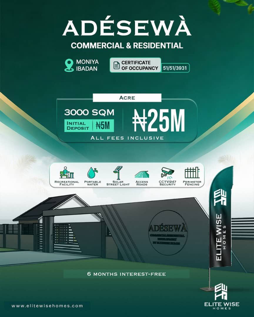 ADÈSÈWÁ ESTATE, MONIYA EXPRESSWAY, IBADAN Not all lands are created equal. Some sit and wait. Some grow slowly. But a rare few — like ADÈSÈWÁ ESTATE — explode in value before your building plan is ready. 📍 Strategically positioned along Moniya Expressway, minutes from major developments ( IITA), industrial hubs (ibadan dry port), and transport arteries(Moniya train station, Ojoo Bus Terminal)— this isn’t just land, it’s a future-proof investment. 🛡️ Why ADÈSÈWÁ? • Certified with C of O — no "come back tomorrow" stories. • Plots Allocated Instantly — zero delay, 100% delivery. • Solid infrastructure rising daily: roads, perimeter fencing — all in motion. • Gated Residential Layout — 100% serene, secure, and livable. • Commercial Axis designed for visibility, traffic, and profit. Adésewà, Moniya Ibadan is evolving into a prime investment hub, and now is the moment to get on board! What’s New: Enhanced Infrastructure: More accessible, beautiful, valuable. Skyrocketing Value: Every phase adds more appreciation. Prime Potential: A landmark for high-return investors. Why You Can’t Miss This: ✅ Unmatched Growth ✅ Exclusive Opportunity ✅ Investor-Focused ⏳ The Time is Now! Secure your place among visionary investors shaping the future. Title: C of O Limited Offer: Plots 500 sqm - N4.5m Commercial 1000sqm - N10m Acre - N25m ✅ All Fees Inclusive ✅ Up to 6 months Payment Plan interest free ! 📞 Connect with us today ADÈSÈWÁ ESTATE — Where Land Meets Legacy. #RealEstate #RealExMarketplace #Property #BIOListings