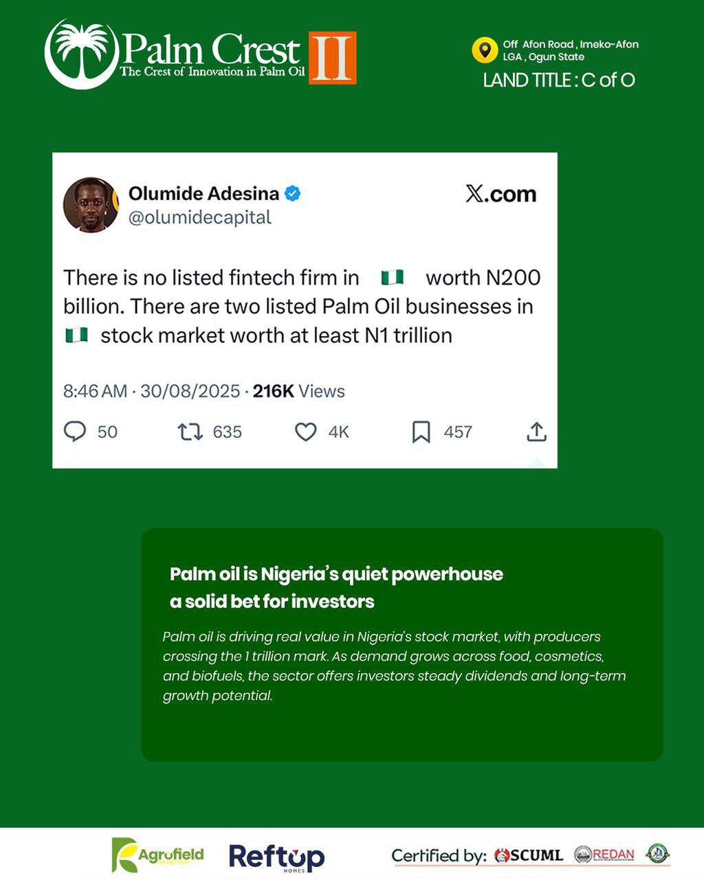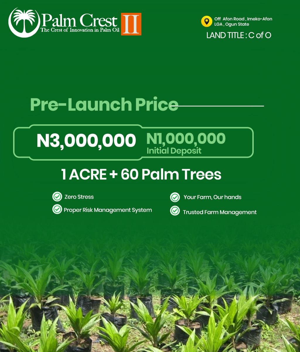PALM CREST PHASE 2: The Crest Of Innovation In Palm Oil Own a Piece of Nigeriaโs Thriving Palm oil Industry! ๐ Prime Location: Strategically located in Imeko Afon Local Government, Ogun State, providing easy access to markets and transportation links. https://maps.app.goo.gl/2wocQZkijbbhUvtb9?g_st=aw ๐ Title: Certificate of Occupancy *Pre-launch Price: *1 Acre - โฆ3,000,000 *1 Hectare - โฆ7,000,000 ๐ฐ *Flexible payment plan available (3 months with no interest/surcharge) Prices are all inclusive of Survey and Documentation *Landmarks ๐ด Imeko-Afon Forest ๐ฎโโ๏ธImeko-Afon LGA ๐ Owode Afon ๐งโ๐Crescent University, Abeokuta ๐จโโ๏ธAlamala Military Barrack ๐ฟ Olumo Rock ๐ซ Federal University of Agriculture, Abeokuta ๐ญ Dangote Cement Factory, Ibese ๐ Adire Market, Abeokuta *Features: ๐ Security ๐ข Palm oil and palm kernel processing mills ๐ช Warehouse and storage areas ๐ท Farm office and library ๐ด *WHY PALM CREST PHASE 2? The Phase 1 is SOLD OUT! Palm crest is a lucrative venture that combines agriculture, innovation, and real estate. It is a pioneering development and offers a unique opportunity to own a piece of Nigeria's thriving palm oil industry without dealing with the daily operations of the farm. Contact us directly for the project brochure containing other information including the projections and timeline. Find below, a link to the declared Revenue and Profit of Presco PLC for 2025 https://nairametrics.com/2026/01/31/presco-plc-posts-n178-56-billion-pretax-profit-in-2025-on-strong-growth-trajectory/ See how lucrative the Palm oil business is in Nigeria from players like Presco https://www.tekedia.com/presco-delivers-a-pretax-profit-of-n53-2bn-in-q2-2025-156-growth-from-q2-2024/ #PalmCrest2 #RealEstate #RealExMarketplace #Property #BIOFarms