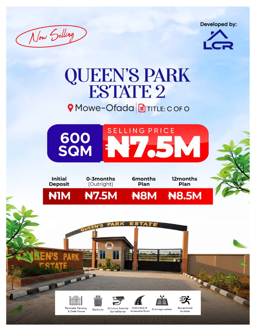 Queens Park Estate, Mowe/Ofada Inspired by Landmark Corporate Reality Ltd, Queen's Park Estate is sophisticated and luxurious land space with fast and speedy developments (estate gate, gate house, road-connect & co) that reflects that magical merging of inspiration and architecture. The estate is a masterpiece of design and craftsmanship featuring (magnificent layout, visitors’ park, and lots more). Queen's Park Estate location iş Mowe/ ofada by Sagamu Interchange which iş a perfect investment area with high Return on Investment(ROI) Queens Park on maps https://maps.app.goo.gl/5UAm1g5F1vo6ZobD9 NEIGHBORHOOD - International Breweries - Nestlé Foods Plc - Eterna Plc - Olam Plc - Proposed Gold Refinery Highlights and proposed features - Good road network - Gated and secured environment - Perimeter fencing - Paved road and drainage - Sports corridors - Shopping centres - Street lights - Potable water - Electricity - Security systems and lots more *TITLE: Certificate of Occupancy *PRICE: N7,500,000 (600SQM) Also available at the Queens Park Estate are 2-Bedroom and 3-Bedroom Bungalows at N47 Million and N60 Million respectively. Contact us directly on WhatsApp +2347069652227 #RealEstate #RealExMarketplace #Property #BIOListings
