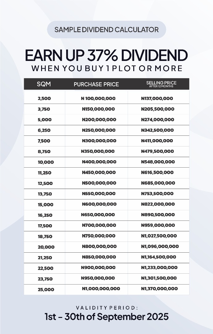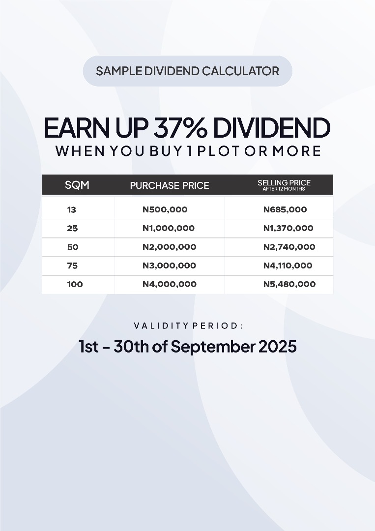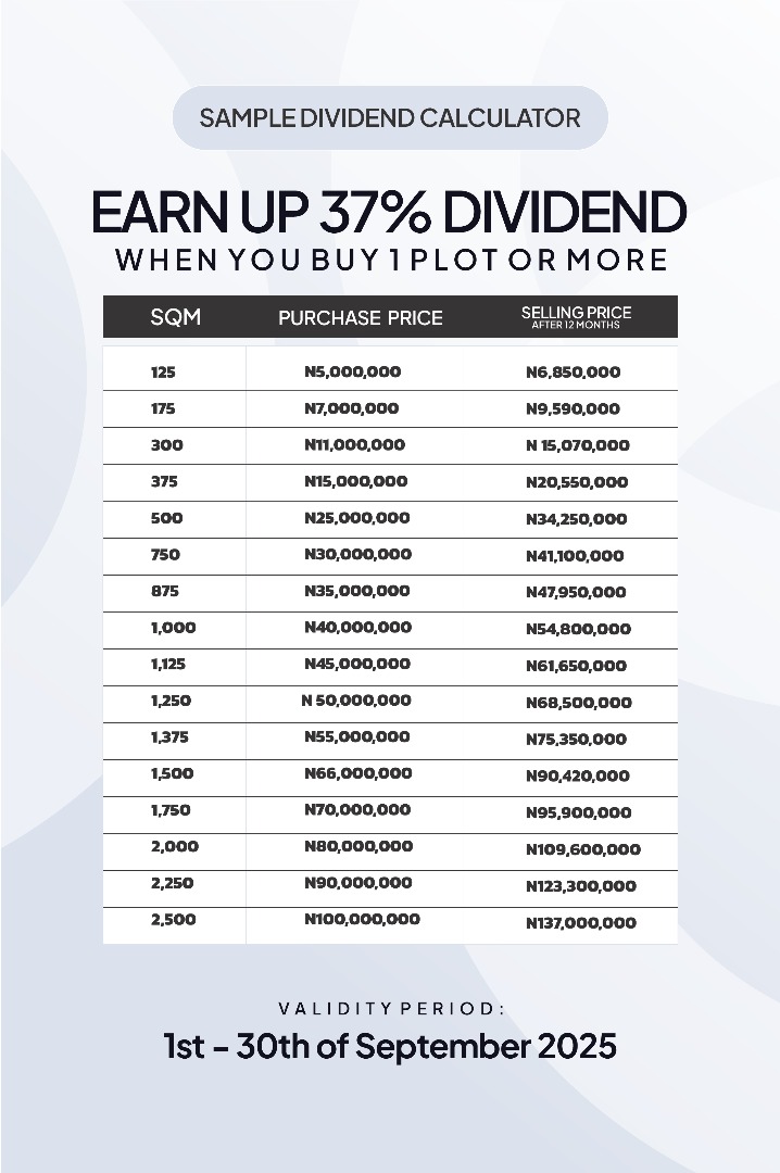 CONSOLIDATE YOUR WEALTH WITH THE REAL ESTATE CASHBACK 3.0 OFFER ON TIWA GARDEN CITY PHASE II This time is the perfect time to make strategic financial decisions that will shape your future. What better way to grow your wealth than keying into the special Real Estate Cashback 2025 Series 3.0 on Tiwa Garden City Phase II? 🏡🤩 With this Real Estate CashBack 3.0 offer you have a chance to buy SQM of land at Tiwa Garden City Phase II, hold, and resell your land in just 12 months for a profit. *This month, you get to enjoy 37% dividend when you key into RECB OFFER ON TIWA GARDEN CITY PHASE II.* Kindly find sample of breakdown 🚀 When you purchase SQM at N500,000 you will resell at N685,000 after 12months. 🚀 When you purchase SQM at N5, 000,000 you will resell at N6,850,000 after 12months. 👉 *When you buy a plot at N20,000,000 you get to resell for N27,400,000 after 12months.* 🚀 When you purchase SQM at N25,000,000 you will resell at N34,250,000 after 12months. 🚀When you purchase SQM at N66,000,000 you will resell at N90,420,000 after 12months 🚀When you purchase SQM at N100,000,000 you will resell at N137,000,000 after 12months 👉 *You can also key into one acre selling for N120,000,000 and sell for N164,400,000 after 12months* Securing your future with an investment that guarantees 37% profit in just 12 months ensures that your financial portfolio will grow and that 2025 will be the year of substantial financial returns. Don’t wait for the perfect moment—create it! By keying in the Real Estate Cashback 3.0 offer on Tiwa Garden City Phase II Visit https://bit.ly/realestatecashback to get started. #RealEstate #RealExMarketplace #Property #BIOListings
