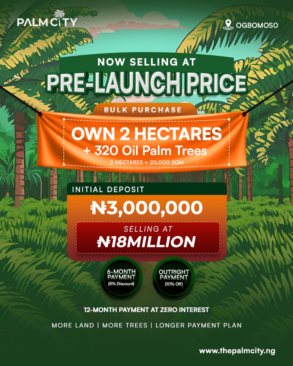 The second phase of the Palm City project is now in the market at the pre-launch price. ✅ With Palm City Ogbomoso, you get… 👊 More land. 👊 More trees 👊 Longer payment plan up to 1 year. 👊 An exclusive offer to expand your land holdings. PALM CITY PRICES 1 acre - N3.6 million 1 hectare - N9 million 2 hectares - N18 million 5 hectares - N45 million 10 hectares - N90 million 25 hectares - N225 million ✅You get up to 12 months payment plan, instead of 6 months. ✅You get 160 trees per hectare, instead of 150 trees. ✅You want to pay in 6 months? You get a 5% discount. ✅Paying outright? (that’s paying in full, within 3 months), you get a 10% discount. Find below, a link to the declared Revenue and Profit of Presco PLC in 2025 https://nairametrics.com/2026/01/31/presco-plc-posts-n178-56-billion-pretax-profit-in-2025-on-strong-growth-trajectory/ See what's been said about Palm Oil Production business in Nigeria https://www.tekedia.com/okomu-oil-shows-that-agriculture-is-nigerias-ai-moment/ https://www.tekedia.com/palm-oil-is-gold-and-bitcoin-in-nigeria-right-now-as-presco-okomu-oil-continue-growth/ #RealEstate #RealExMarketplace #Property #BIOFarms