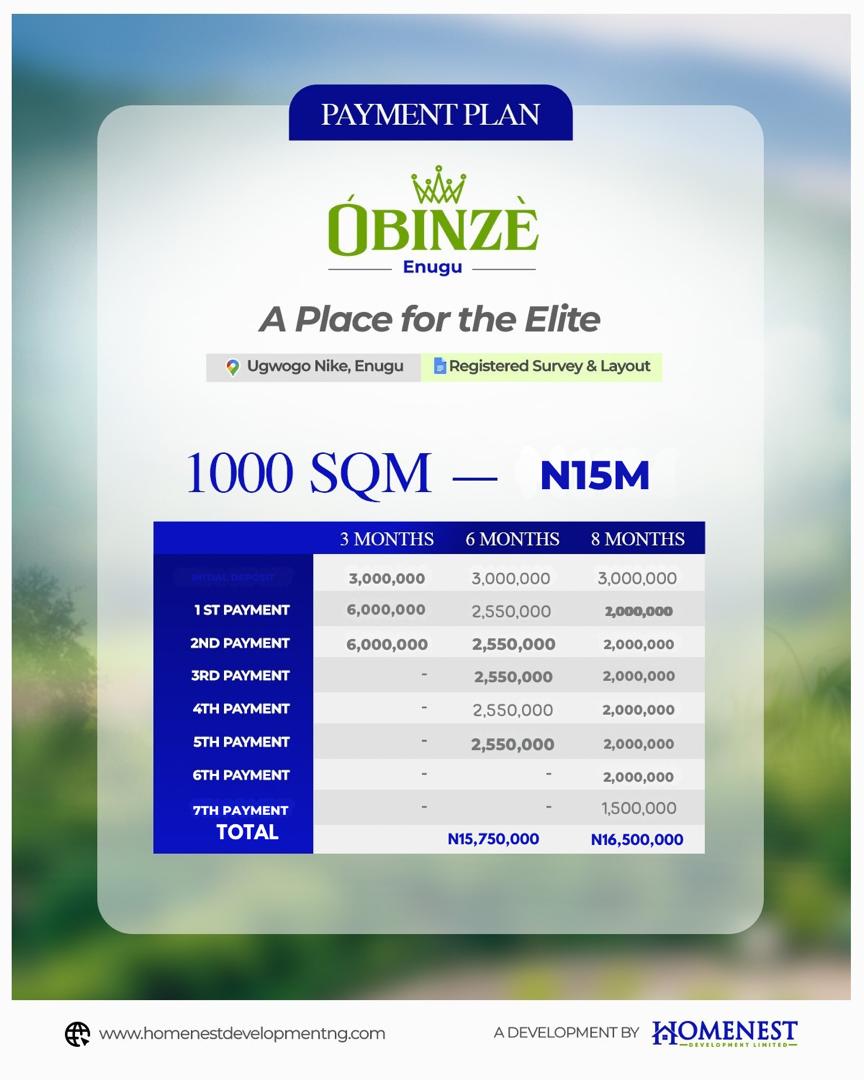 OBINZE ENUGU — A Place for the Elite (BUY AND BUILD LAND WITH INSTANT ALLOCATION ON INITIAL DEPOSIT) • 300 sqm: ₦4.5M with an initial deposit of ₦1M • 500 sqm: ₦6 with an initial deposit of ₦1M • 1000 sqm (Commercial): ₦15M with an initial deposit of ₦3M 🎉 Bonus: Instant allocation once your initial deposit is made.